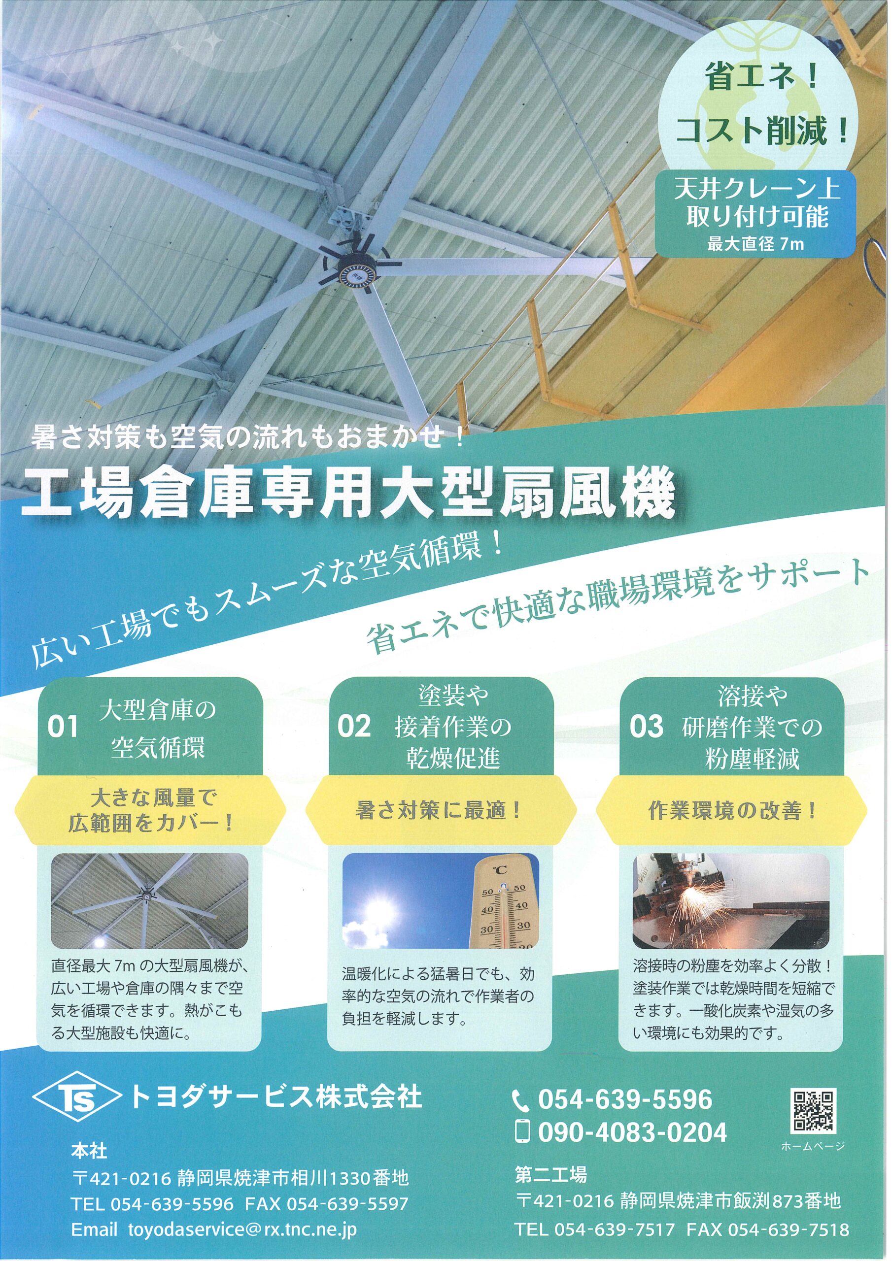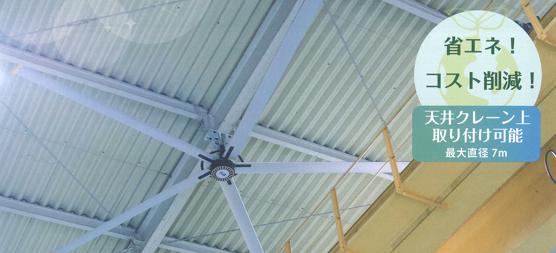 直径最大7mの大型扇風機が広い工場や倉庫の隅々まで空気を循環させます。